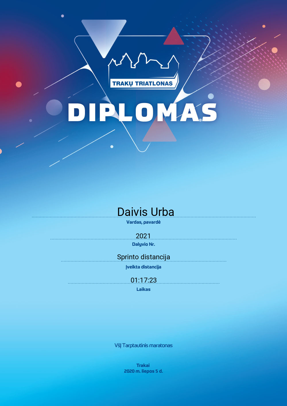 21 Daivis Urba Kauno Triatlono Klubas 2021 Lithuania Sprinto distancija 01:17:23 00:13:23 00:00:38 00:41:11 00:00:33 00:21:36 Diplomas
