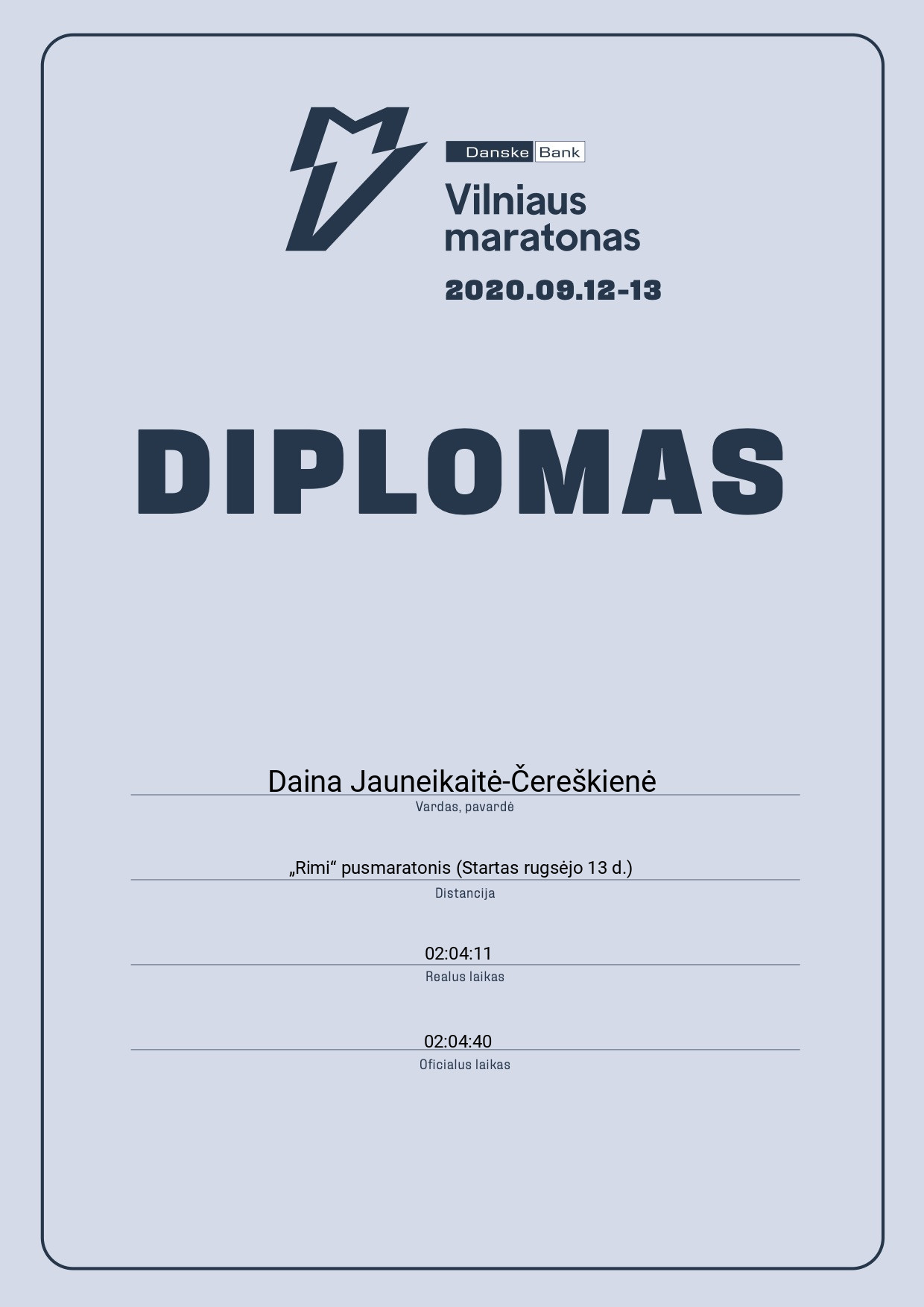 | 588 | Daina Jauneikaitė-Čereškienė | 10869 | Lithuania | „Rimi“ pusmaratonis (Startas rugsėjo 13 d.) | 02:04:40 | Diplomas | |