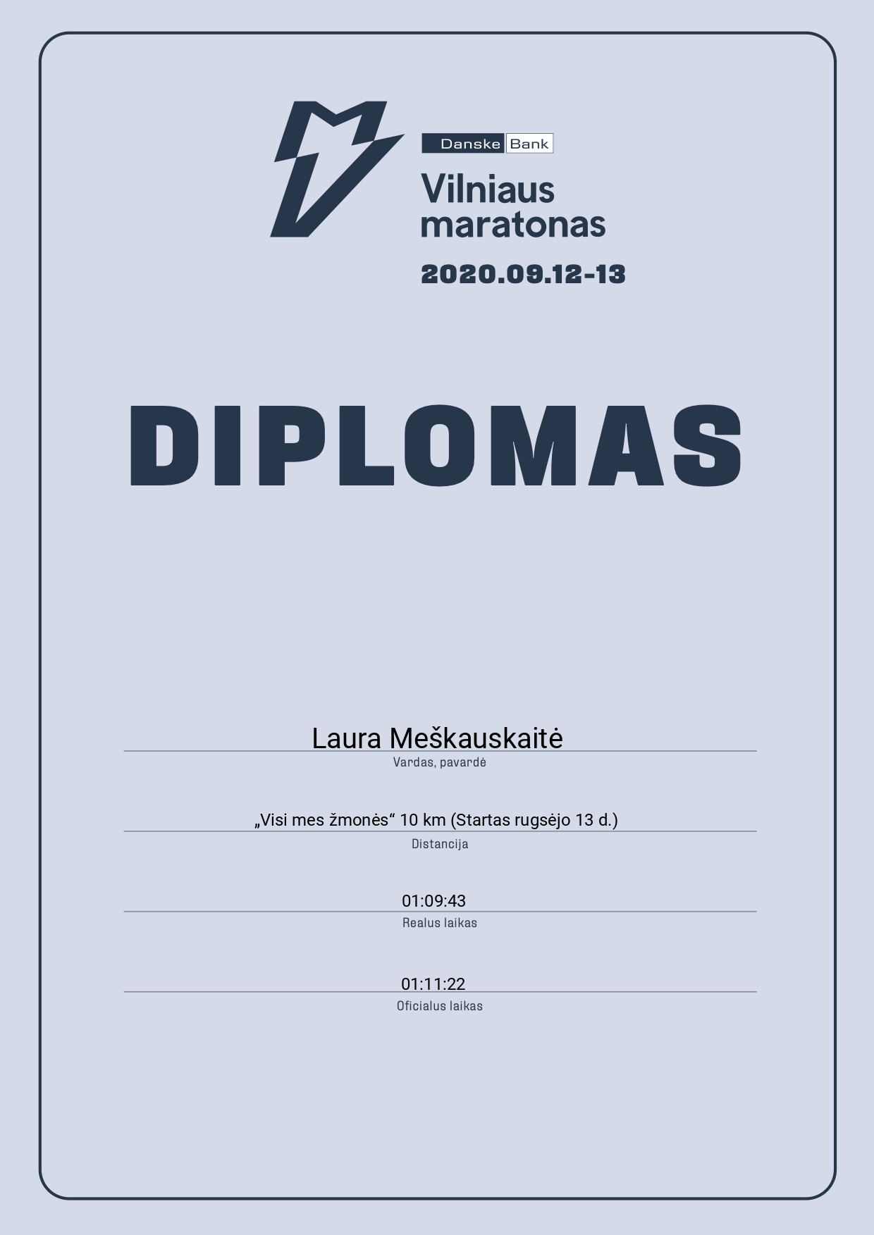 | 975 | Laura Meškauskaitė | 20444 | Lithuania | „Visi mes žmonės“ 10 km (Startas rugsėjo 13 d.) | 01:11:22 | Diplomas | |
