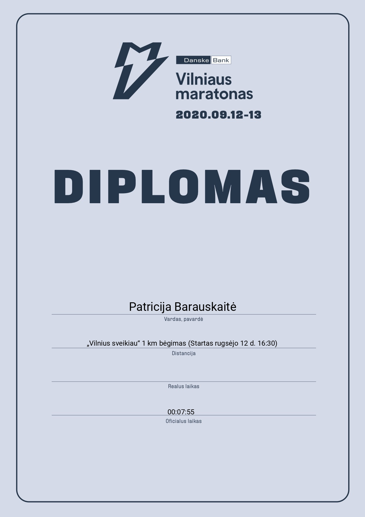 | 471 | Patricija Barauskaitė | Kalnenu | 60373 | Lithuania | „Vilnius sveikiau“ 1 km bėgimas (Startas rugsėjo 12 d. 16:30) | 00:07:55 | Diplomas |