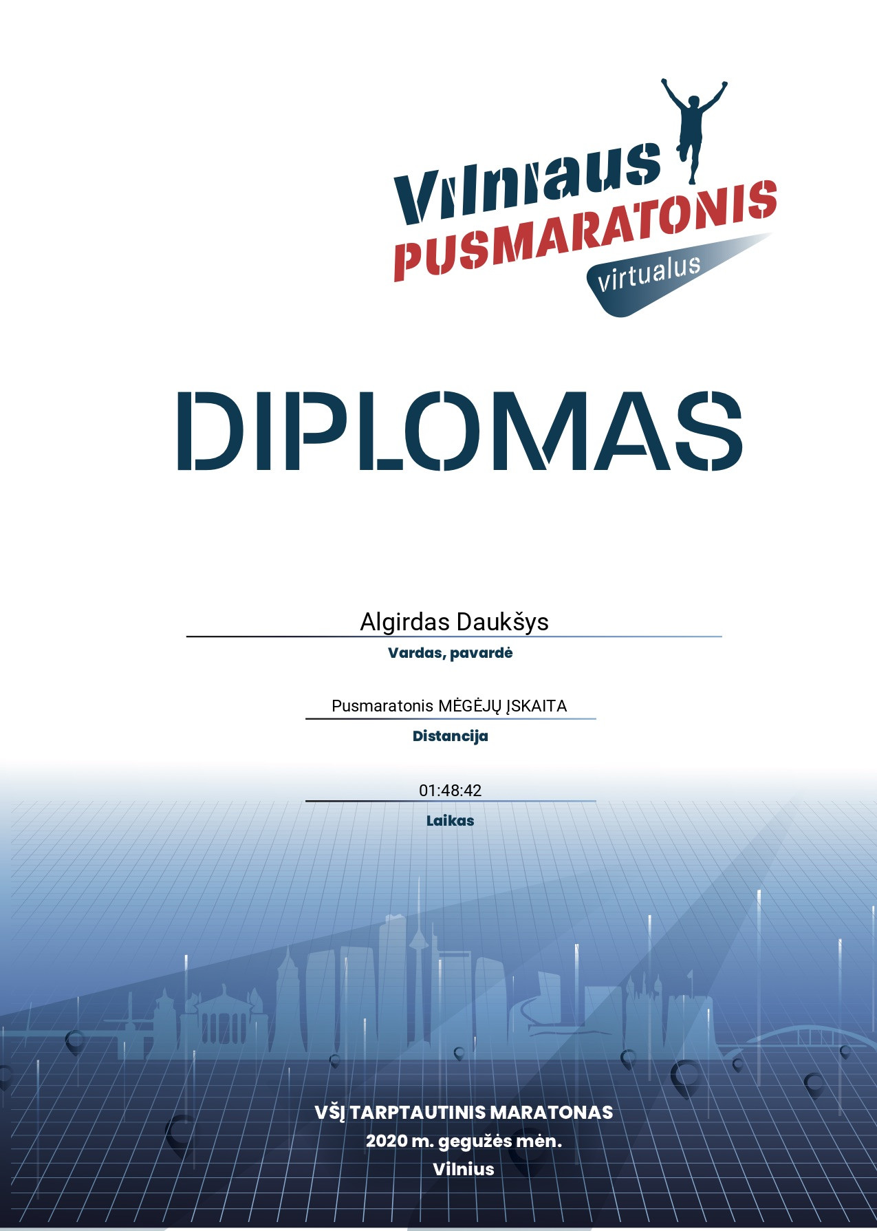 | 22 | Algirdas Daukšys | Šilalės SM | 2104 | Lithuania | Pusmaratonis MĖGĖJŲ ĮSKAITA | 01:48:42 | Diplomas |