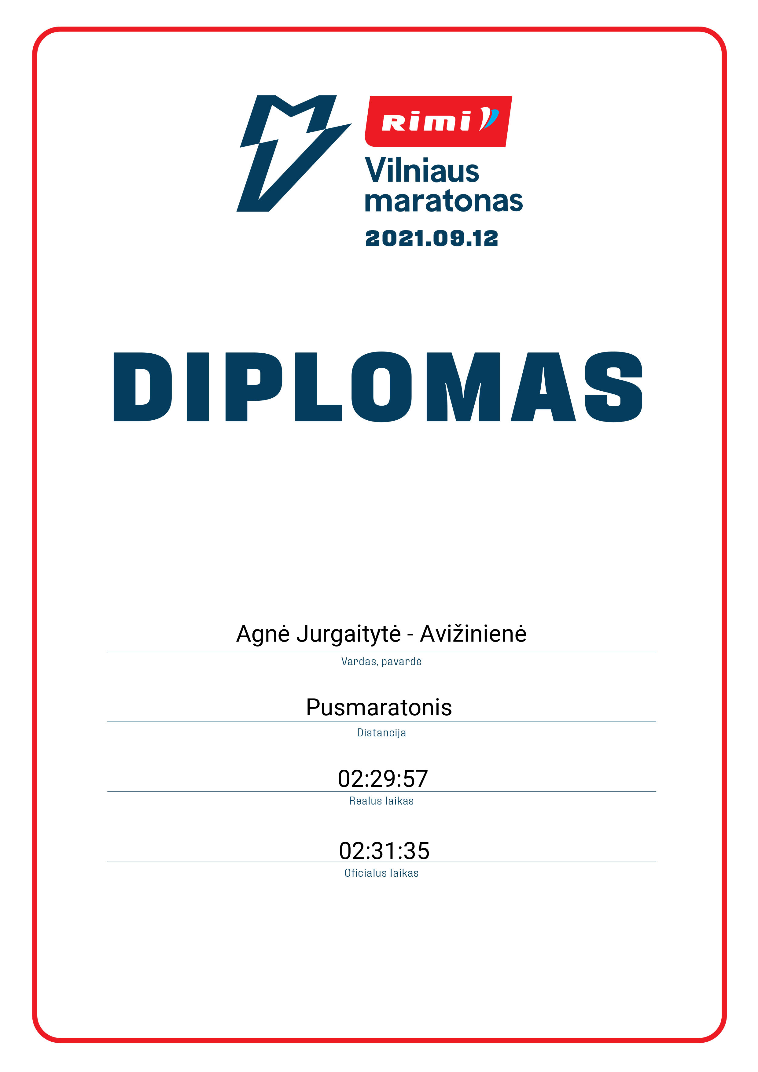 | 1015 | Agnė Jurgaitytė - Avižinienė | Avižos | 10081 | Lithuania | Pusmaratonis | 02:31:35 | Diplomas |
