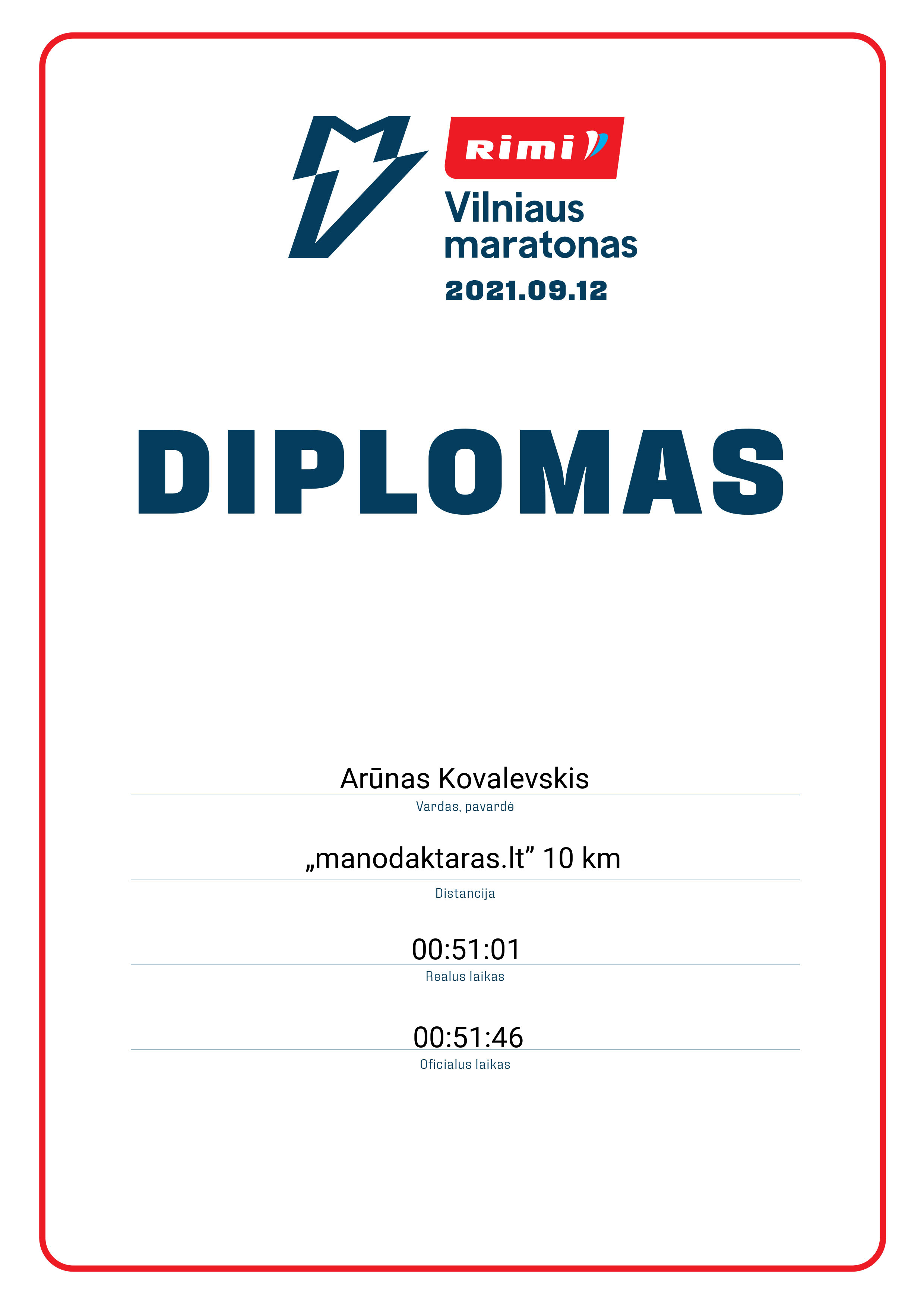 | 248 | Arūnas Kovalevskis | 20966 | Lithuania | „manodaktaras.lt” 10 km | 00:51:46 | Diplomas | |