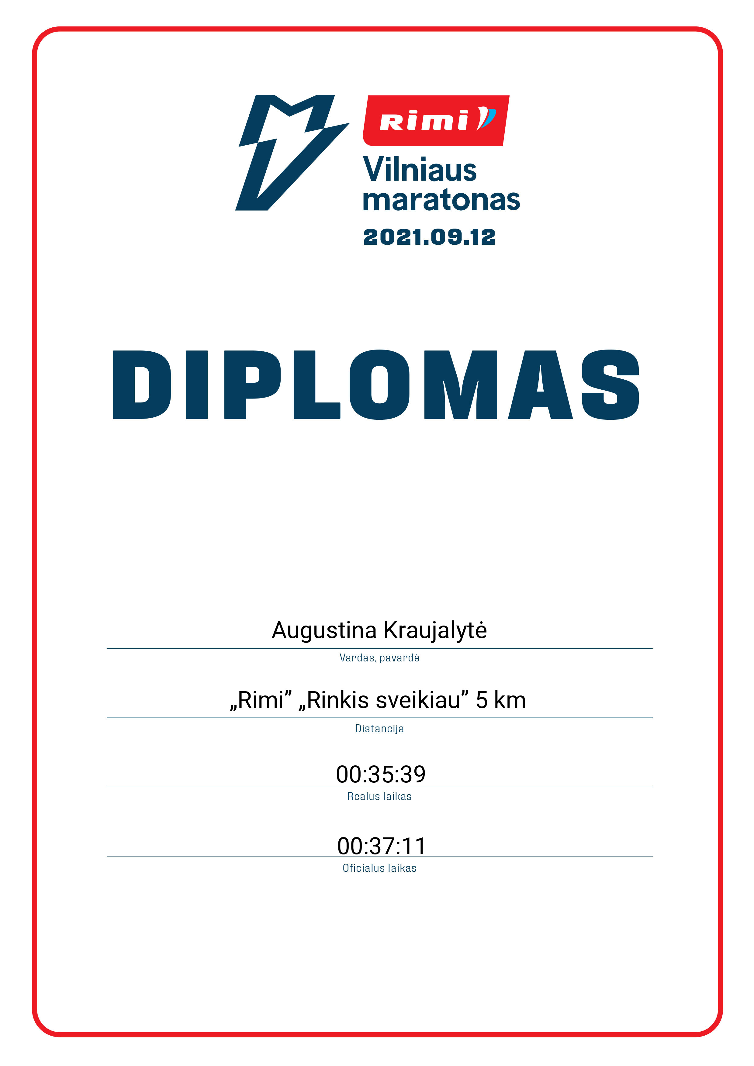 | 1230 | Augustina Kraujalytė | 32314 | Lithuania | „Rimi” „Rinkis sveikiau” 5 km | 00:37:11 | Diplomas | |