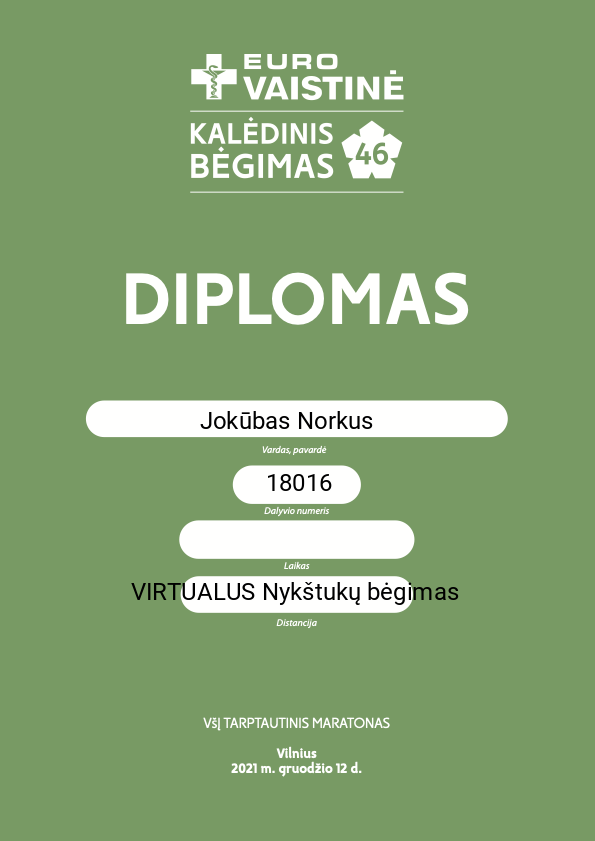 | 2 | Justinas Ruika | Ydyllic | 13017 | Lithuania | VIRTUALUS 6 km bėgimas | 00:31:04 | Diplomas |