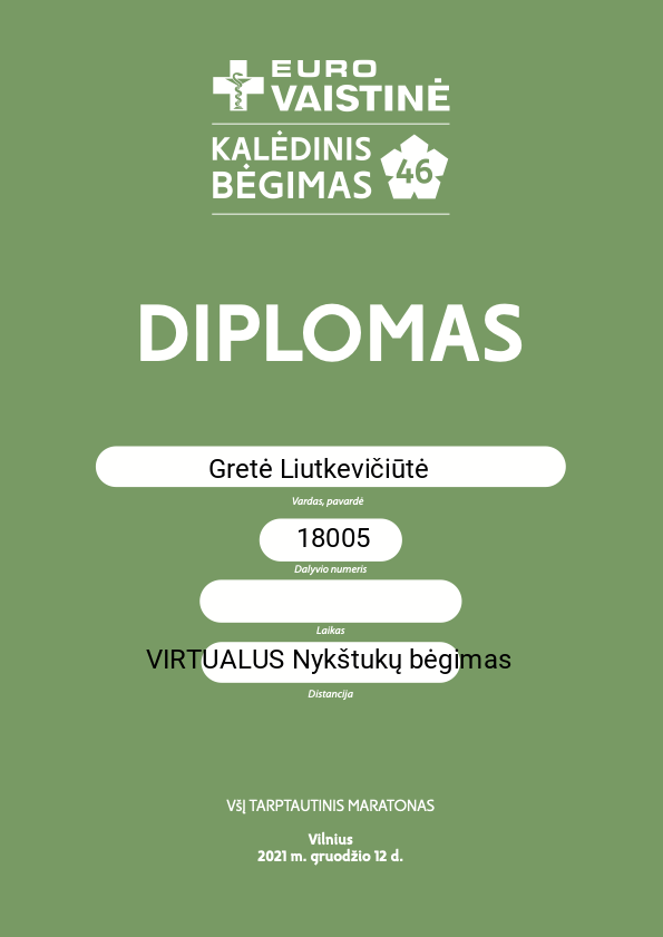 | 1 | Luknė ŠLEKYTĖ | Eurovaistinė | 16015 | Lithuania | VIRTUALUS 3 km bėgimas | 00:15:11 | Diplomas |
