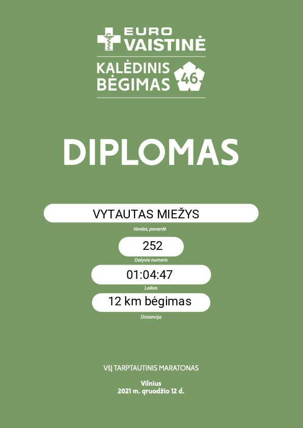 | 230 | VYTAUTAS MIEŽYS | Miežiai | 252 | Lithuania | 12 km bėgimas | 01:05:09 | Diplomas |