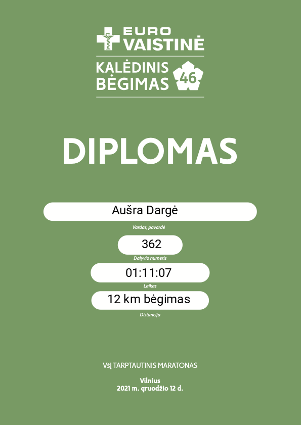 | 185 | Aurelija Simaitytė | Vilnius | 390 | Lithuania | 12 km bėgimas | 01:02:55 | Diplomas |