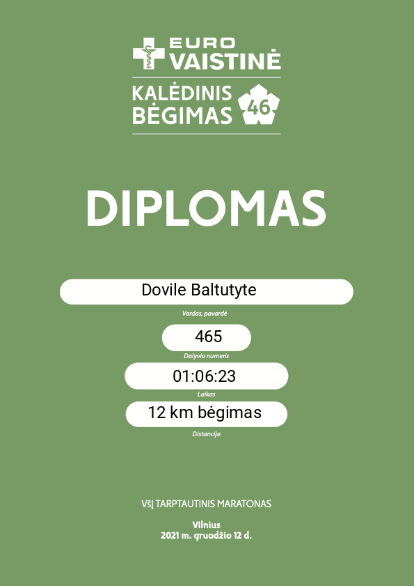 | 274 | Dovile Baltutyte | Ramiu veidu | 465 | Lithuania | 12 km bėgimas | 01:06:58 | Diplomas |