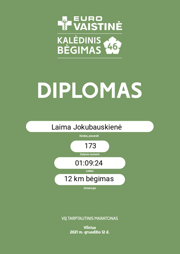 | 341 | Laima Jokubauskienė | LTG | 173 | Lithuania | 12 km bėgimas | 01:10:13 | Diplomas |