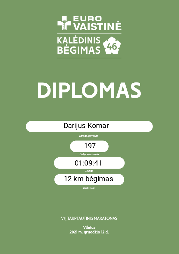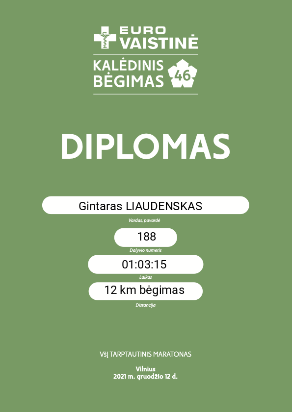 | 6 | Vidas Starkus | F.O.C.U.S. running | 204 | Lithuania | 12 km bėgimas | 00:45:00 | Diplomas |