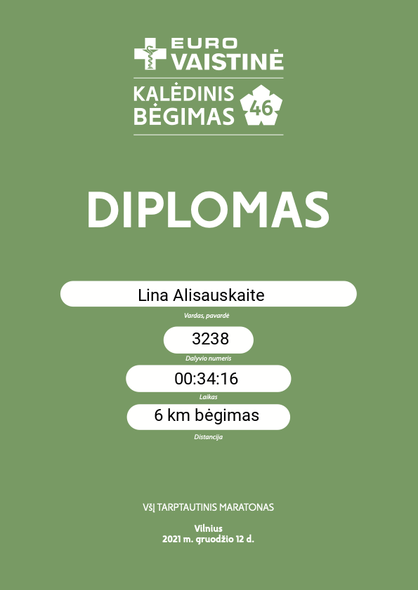 | 167 | Gintarė Mačiūtė | 3243 | Lithuania | 6 km bėgimas | 00:34:36 | Diplomas |