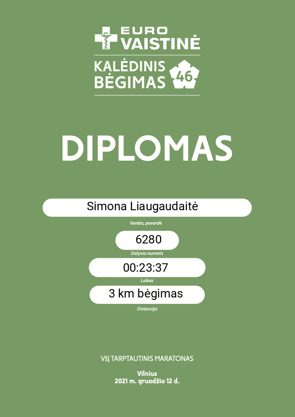 | 173 | Diana Šapaitė | Welness Team by Thermo Fisher | 6292 | Lithuania | 3 km bėgimas | 00:20:49 | Diplomas |