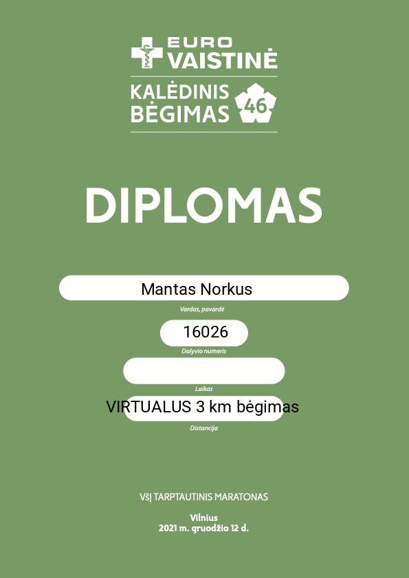 4 Mantas Norkus 16026 Lithuania VIRTUALUS 3 km bėgimas 00:16:35 Diplomas