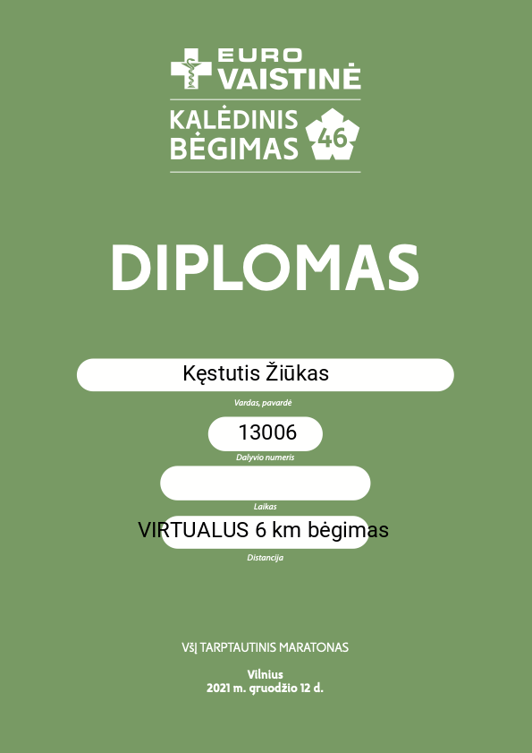 4 Kęstutis Žiūkas eurovaistine 13006 Lithuania VIRTUALUS 6 km bėgimas 00:34:19 Diplomas