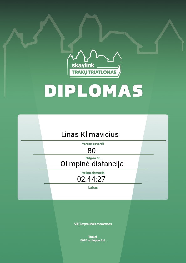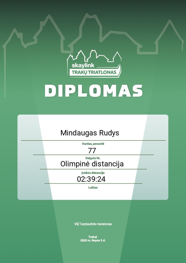 | 72 | Mindaugas Rudys | CIRKO MEŠKUTĘS | 77 | Lithuania | Olimpinė distancija | 02:39:24 | Diplomas |
