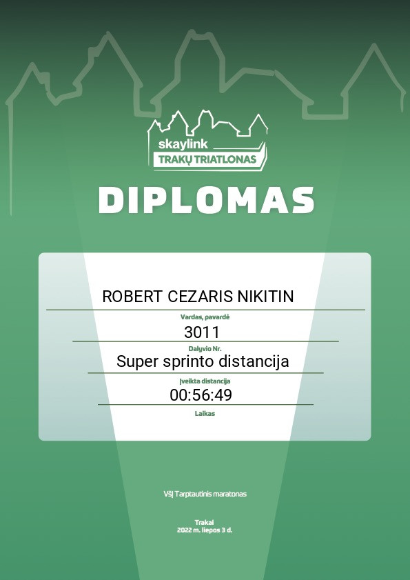 | 48 | ROBERT CEZARIS NIKITIN | Plaukimo veteranų klubas “Žolininkai” | 3011 | Lithuania | Super sprinto distancija | 00:56:49 | Diplomas |