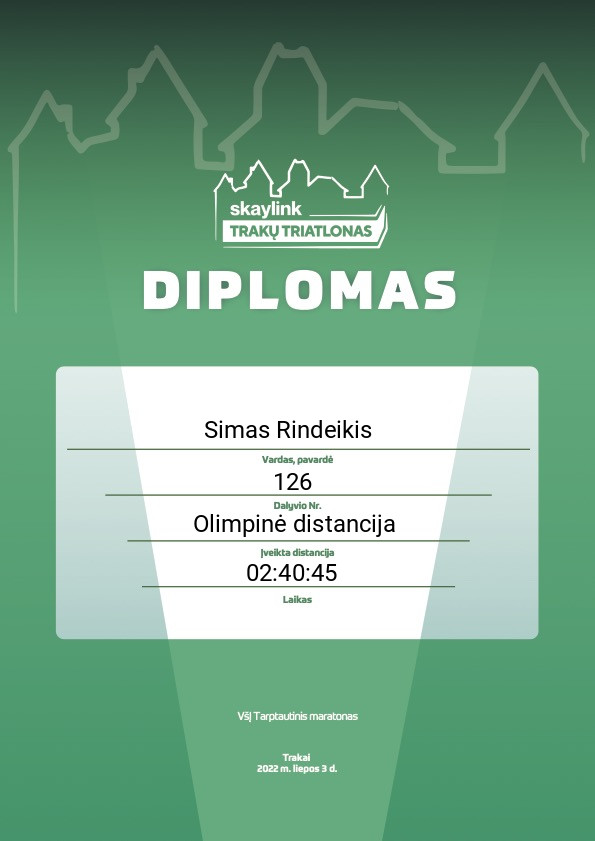 | 76 | Simas Rindeikis | Klaipėdos Triatlono Klubas | 126 | Lithuania | Olimpinė distancija | 02:40:45 | Diplomas |