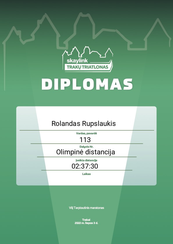 | 66 | Rolandas Rupslaukis | Klaipėdos Triatlono klubas | 113 | Lithuania | Olimpinė distancija | 02:37:30 | Diplomas |