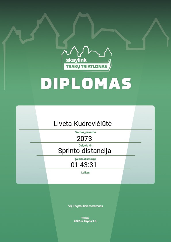 | 22 | Erikas Aukštikalnis | Kauno Triatlono Klubas | 163 | Lithuania | Olimpinė distancija | 02:14:21 | Diplomas |