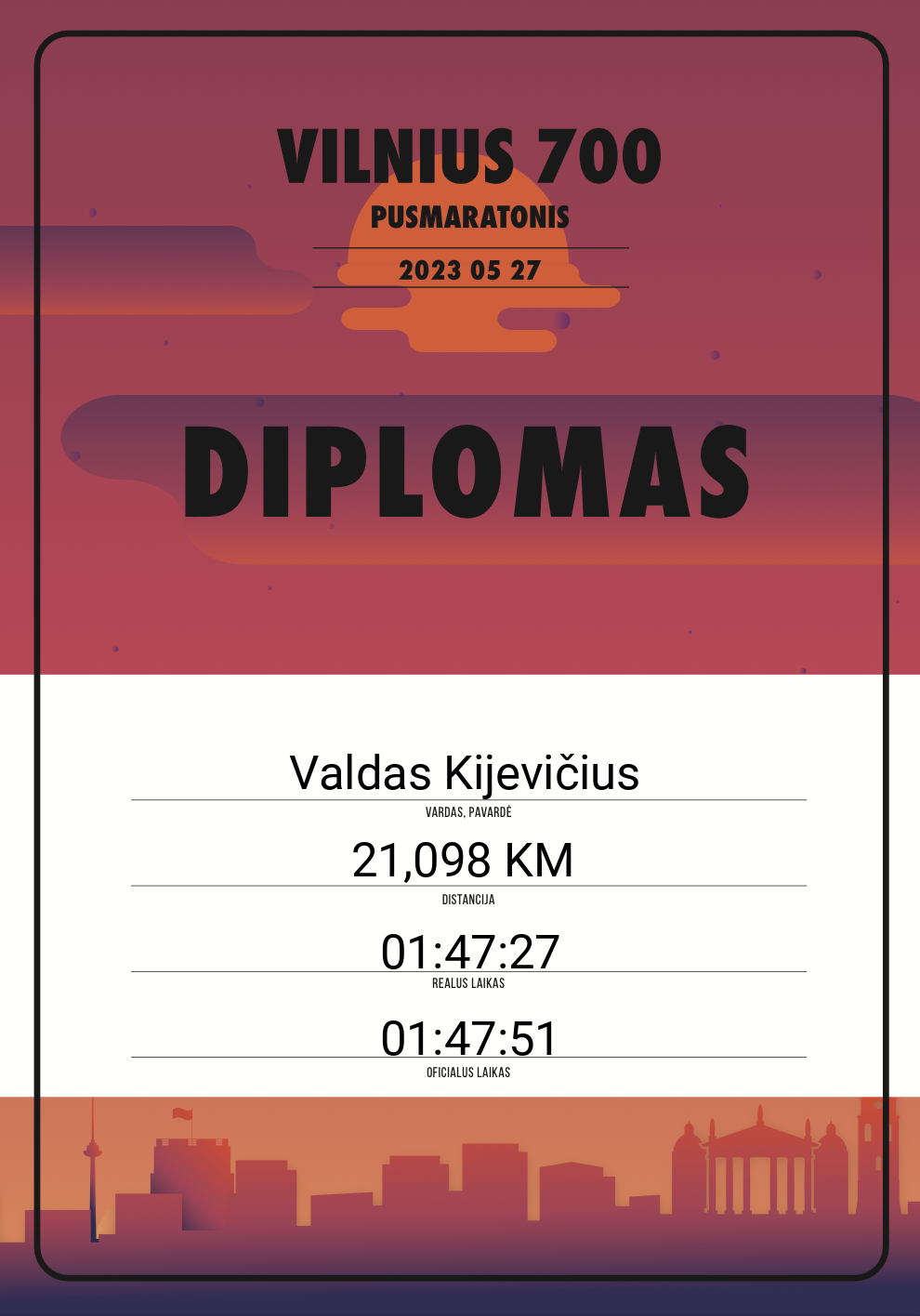 | 711 | Robert Vejalis | 10072 | Lithuania | 21,098 KM | 02:11:25 | Diplomas | |