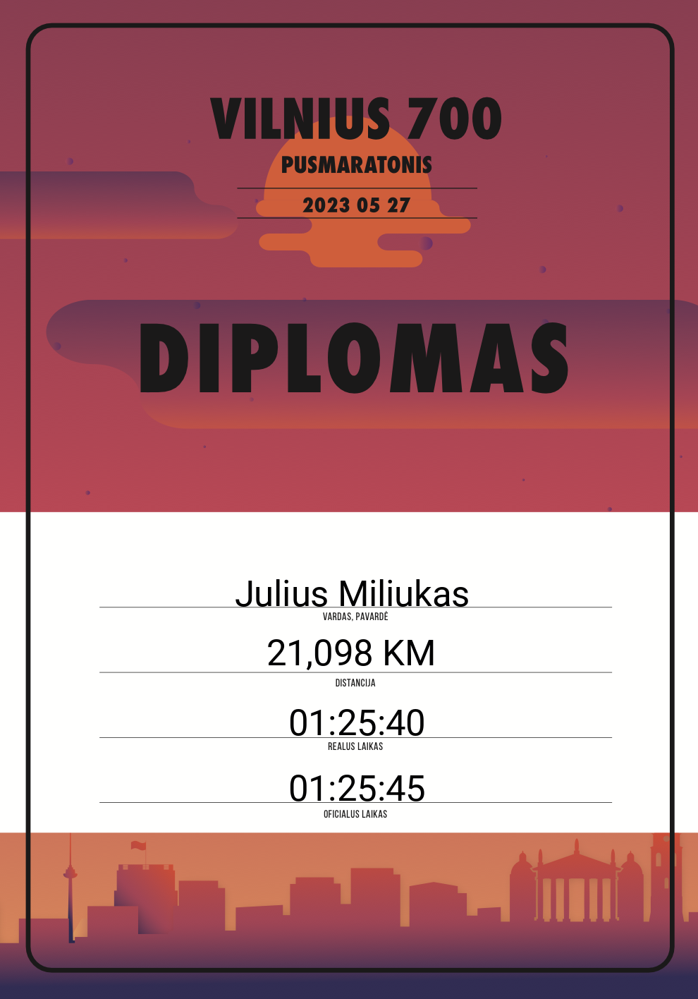 | 21 | Valdemaras Milkus | F.O.C.U.S. running | 10770 | Lithuania | 21,098 KM | 01:24:10 | Diplomas |
