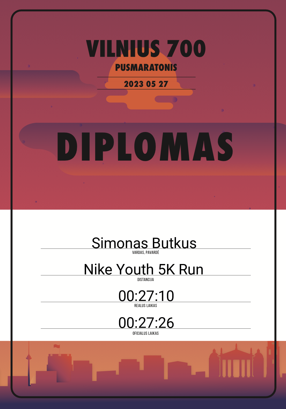 | 155 | Simonas Butkus | Sostinės sporto centras | 30447 | Lithuania | Nike Youth 5K Run | 00:27:26 | Diplomas |