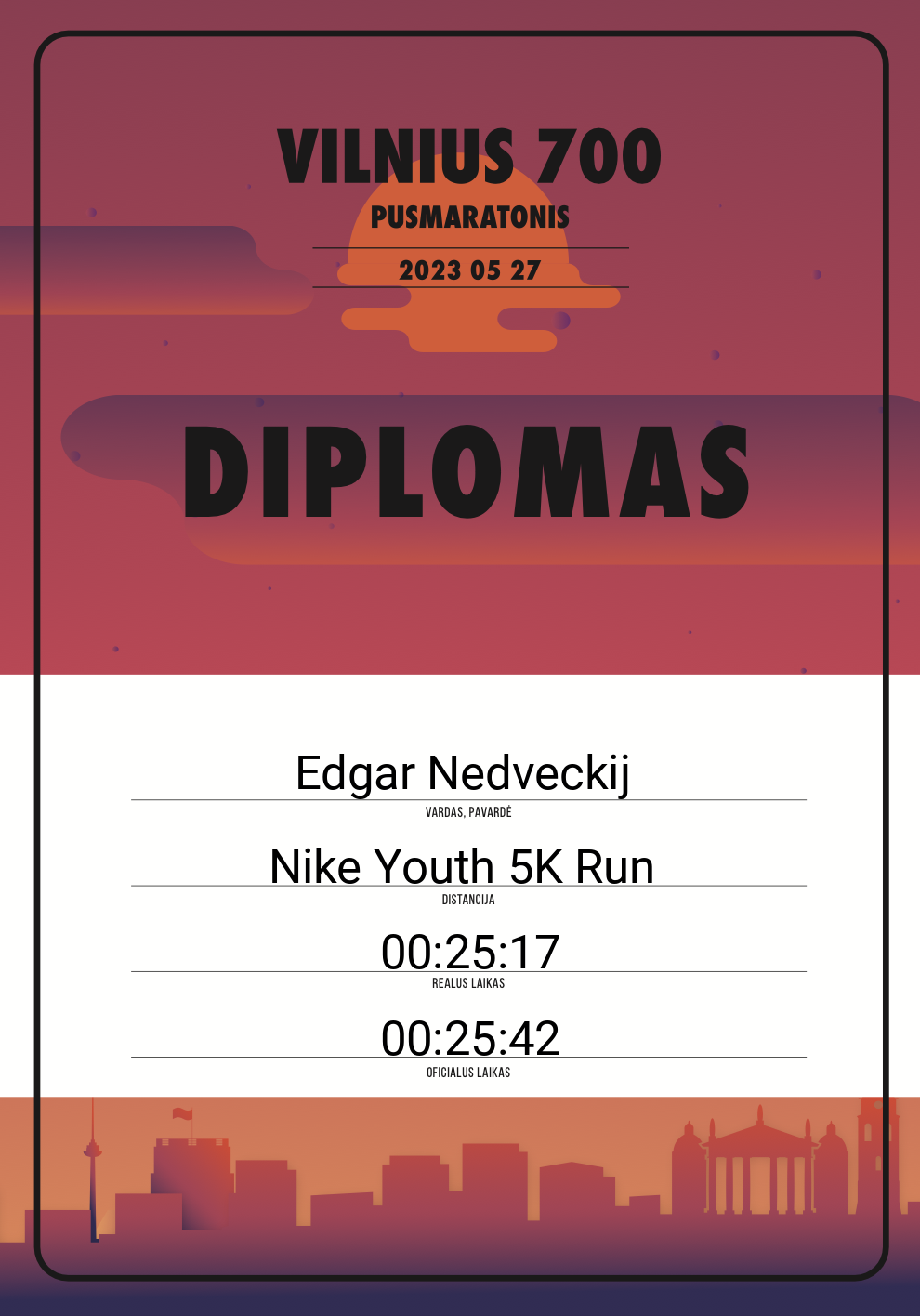 | 112 | Edgar Nedveckij | Sostinės sporto centras | 30464 | Lithuania | Nike Youth 5K Run | 00:25:42 | Diplomas |