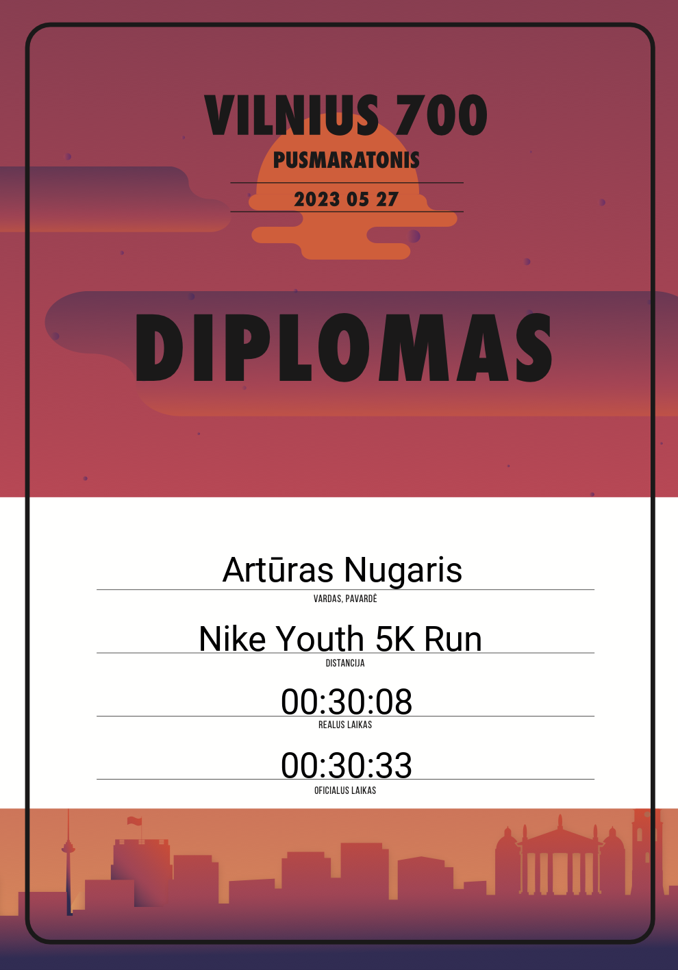 | 255 | Artūras Nugaris | 30246 | Lithuania | Nike Youth 5K Run | 00:30:33 | Diplomas |