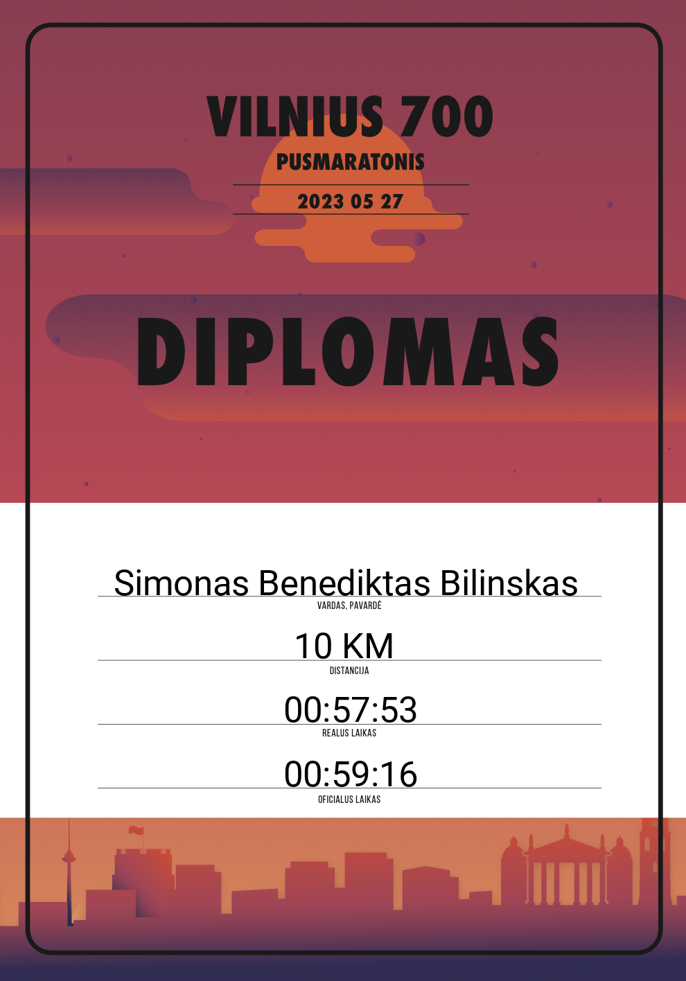 | 490 | Simonas Benediktas Bilinskas | Love Streams Running | 20463 | Lithuania | 10 KM | 00:59:16 | Diplomas |