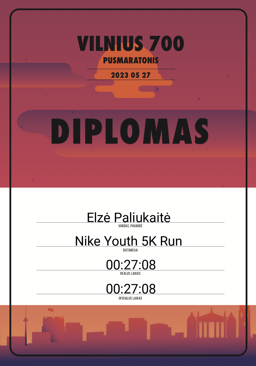 | 60 | Ernesta Kundrotaitė | Teleperformance LT | 30289 | Lithuania | Nike Youth 5K Run | 00:23:27 | Diplomas |