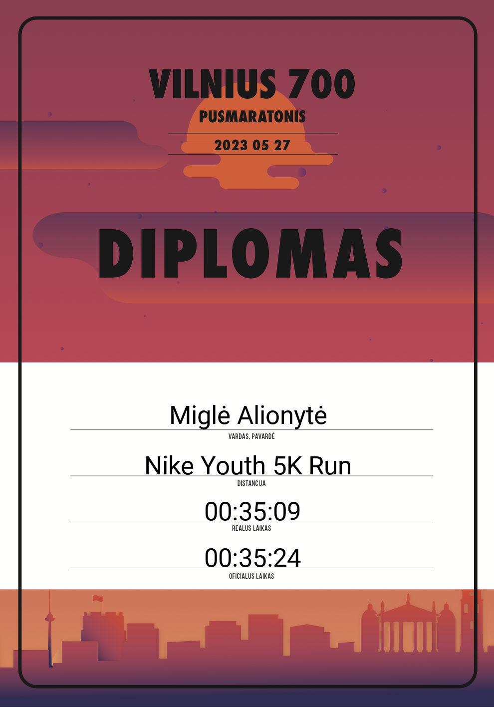 | 397 | Miglė Alionytė | Sportland | 30250 | Lithuania | Nike Youth 5K Run | 00:35:24 | Diplomas |