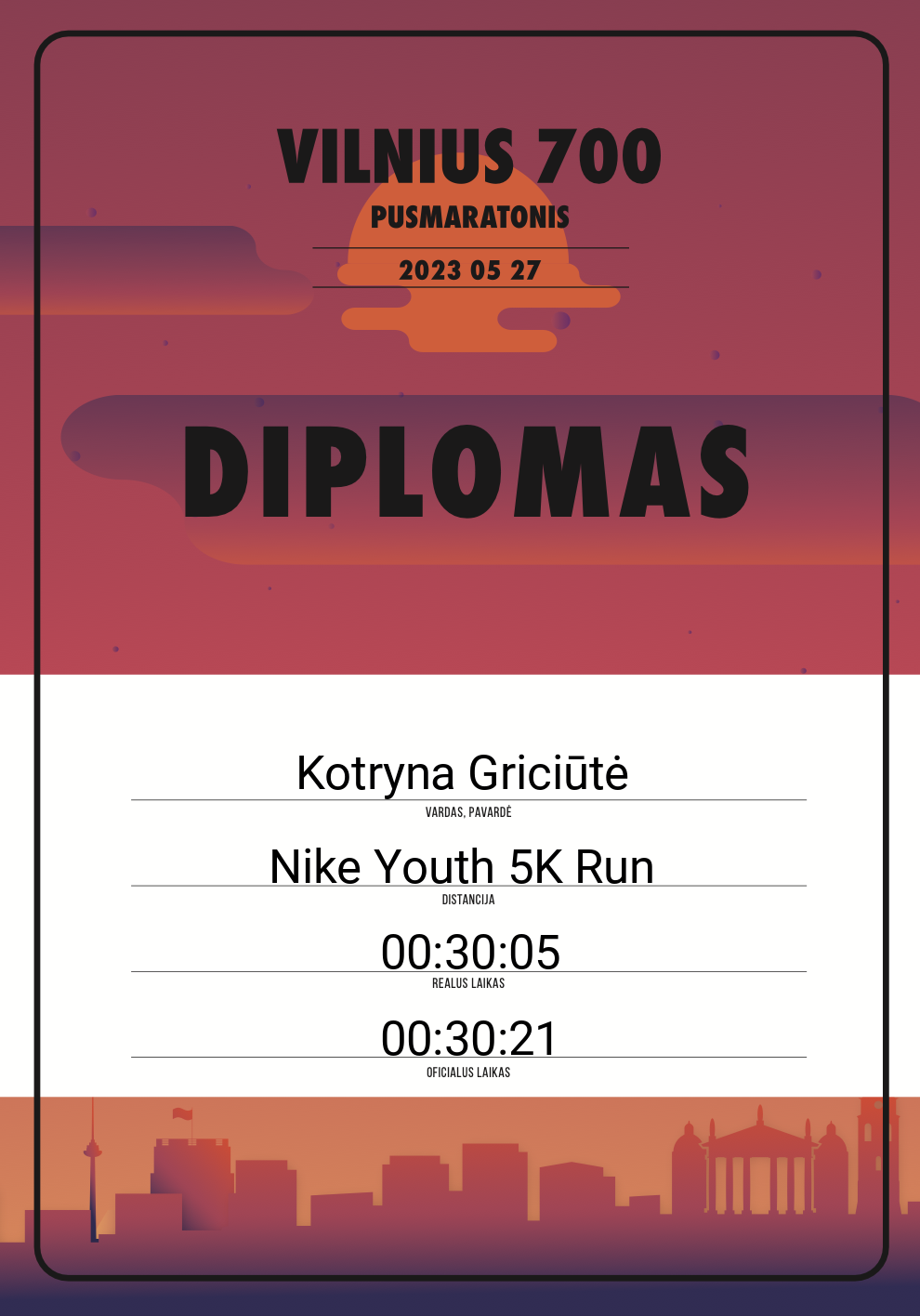 | 245 | Kotryna Griciūtė | 30281 | Lithuania | Nike Youth 5K Run | 00:30:21 | Diplomas | |