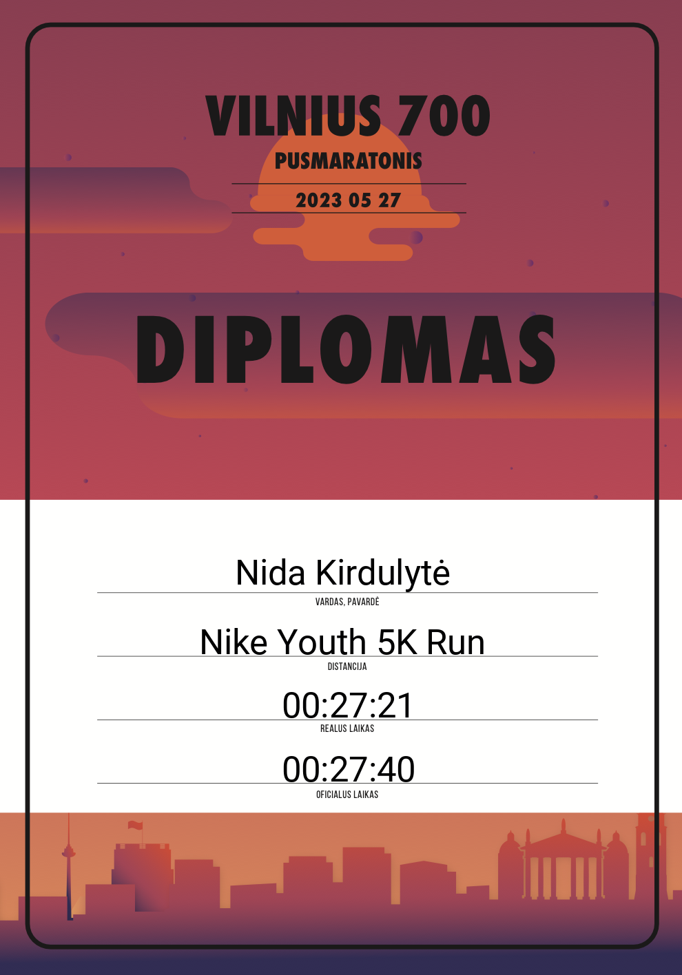 | 164 | Nida Kirdulytė | Lituanica X | 30256 | Lithuania | Nike Youth 5K Run | 00:27:40 | Diplomas |