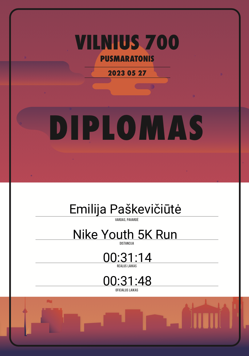 | 309 | Emilija Paškevičiūtė | Biržiška bėga | 30266 | Lithuania | Nike Youth 5K Run | 00:31:48 | Diplomas |
