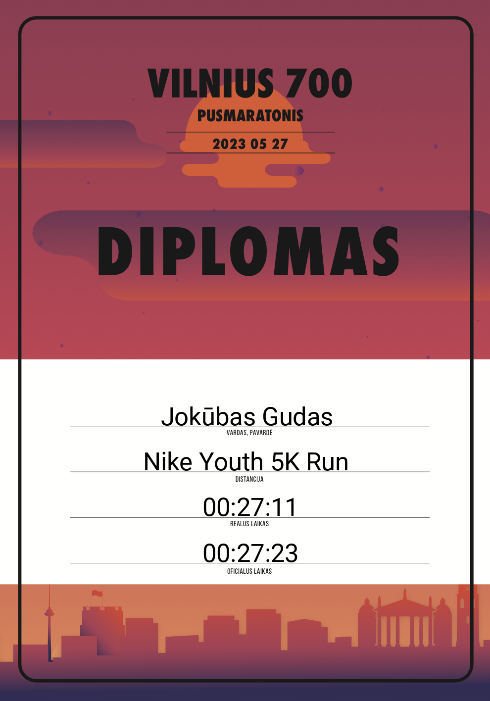 | 153 | Jokūbas Gudas | 30271 | Lithuania | Nike Youth 5K Run | 00:27:23 | Diplomas | |