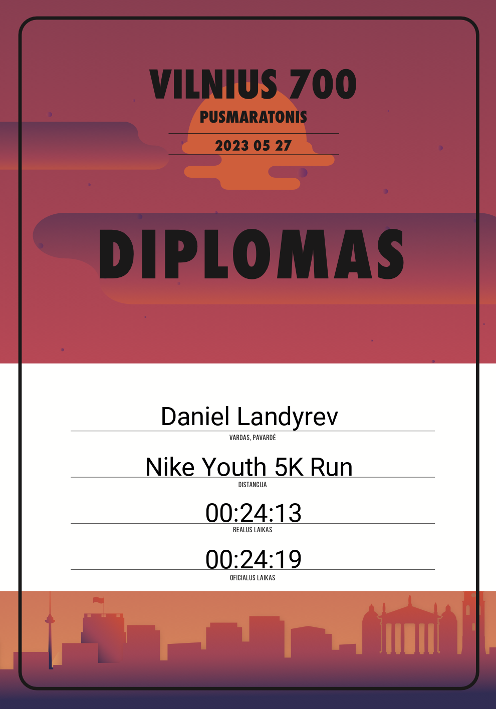 | 82 | Daniel Landyrev | Sostinės sporto centras | 30443 | Lithuania | Nike Youth 5K Run | 00:24:19 | Diplomas |
