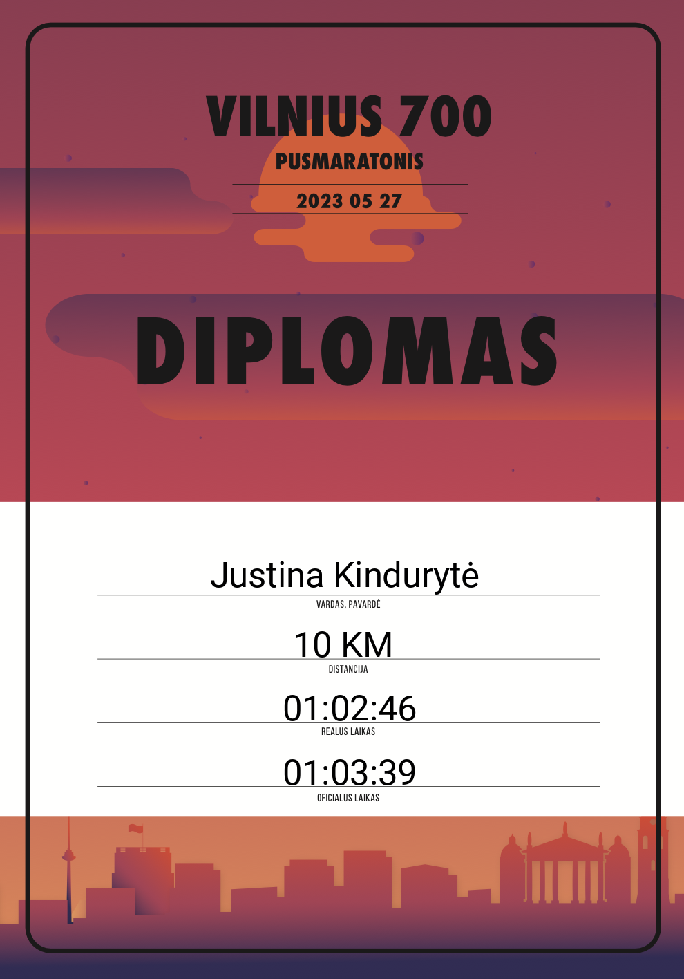 | 681 | Justinas Razgūnas | VISADA CENTRINIS | 20472 | Lithuania | 10 KM | 01:05:06 | Diplomas |