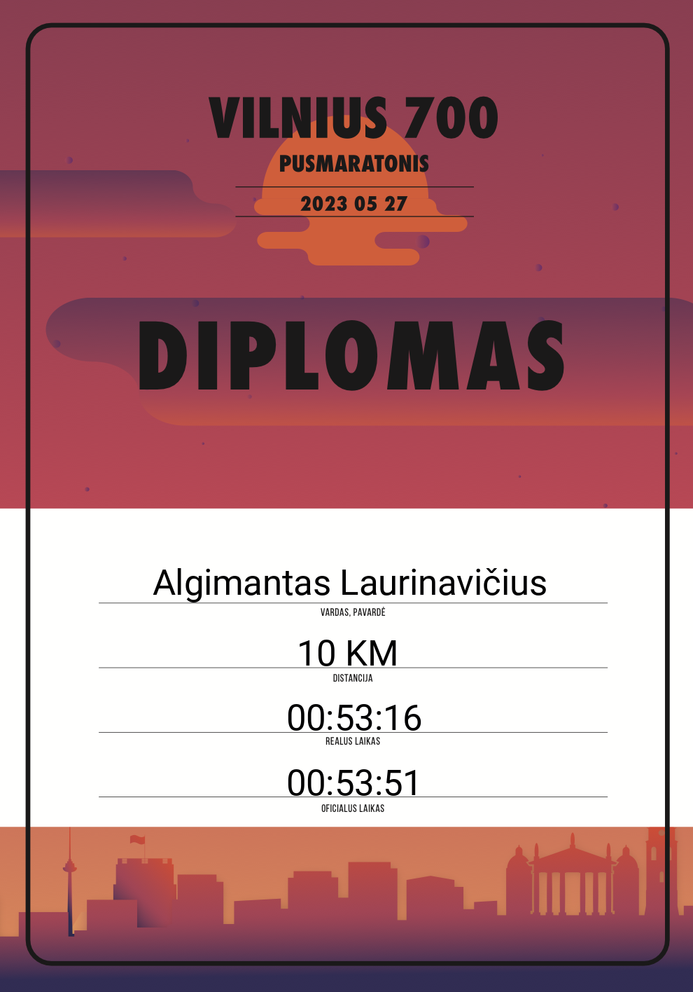 | 269 | Algimantas Laurinavičius | 20092 | Lithuania | 10 KM | 00:53:51 | Diplomas | |