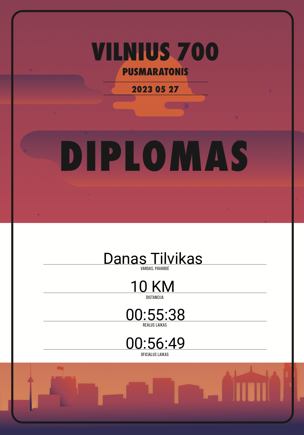 | 397 | Danas Tilvikas | 20185 | Lithuania | 10 KM | 00:56:49 | Diplomas | |