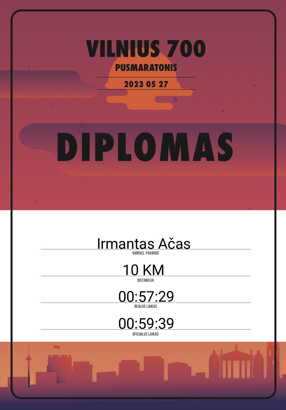 | 719 | Kasparas Kregždė | 20838 | Lithuania | 10 KM | 01:06:09 | Diplomas | |