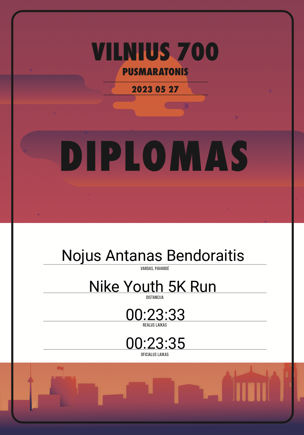 | 64 | Nojus Antanas Bendoraitis | CyberUpgrade | 30338 | Lithuania | Nike Youth 5K Run | 00:23:35 | Diplomas |