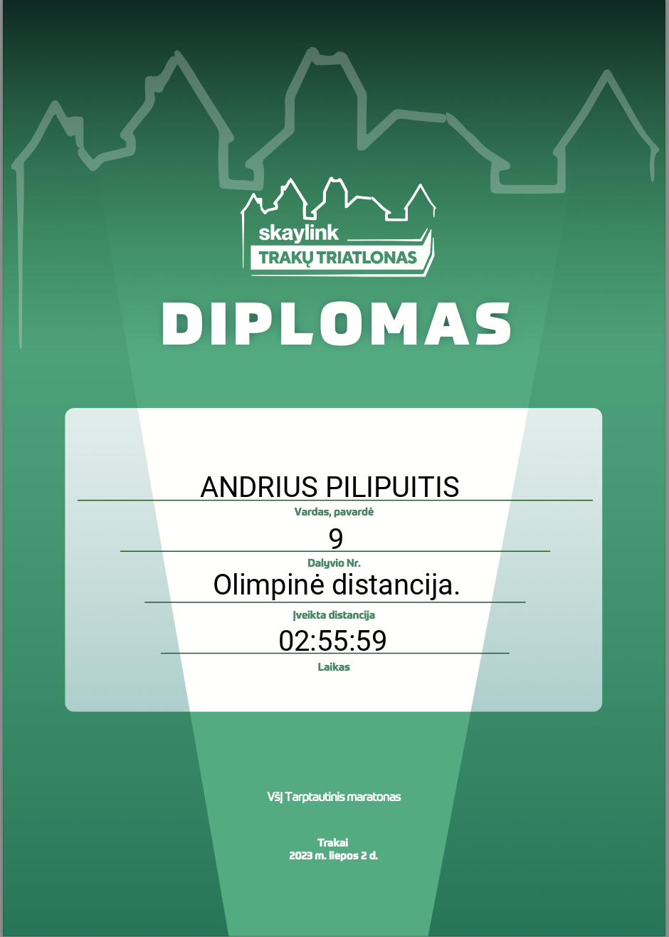 176 Paulius Naujokas Klaipėdos Triatlono Klubas 18 Lithuania Olimpinė distancija. 03:09:23 00:45:06 00:02:57 01:27:01 00:12:45 00:13:05 00:13:17 00:01:49 00:52:30 00:13:24 Diplomas
