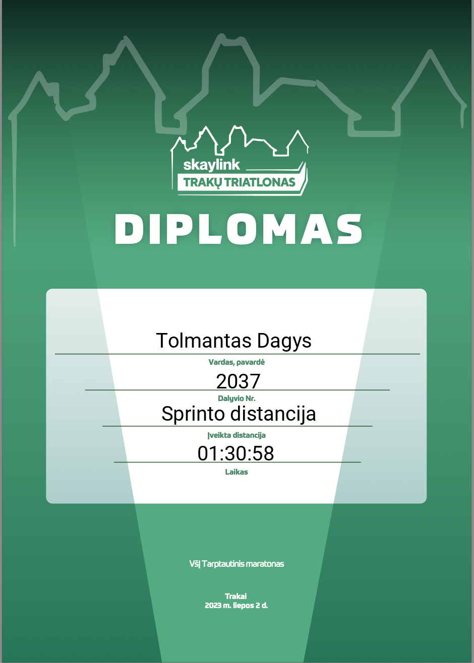 | 105 | Tolmantas Dagys | Love Streams Running | 2037 | Lithuania | Sprinto distancija | 01:30:58 | Diplomas |