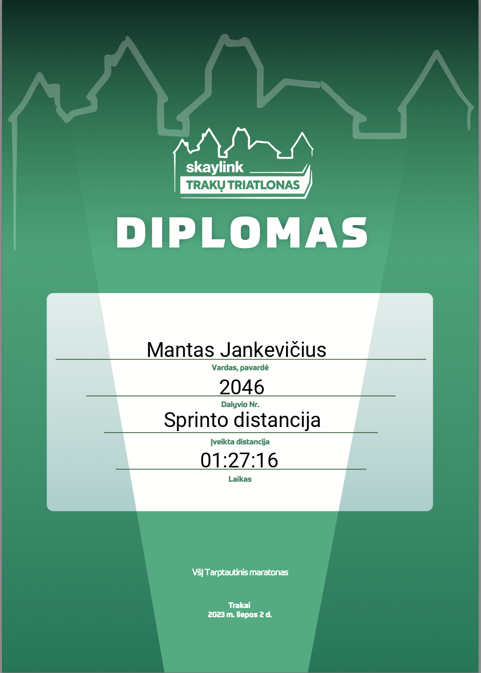| 94 | Mantas Jankevičius | 2046 | Lithuania | Sprinto distancija | 01:27:16 | Diplomas | |