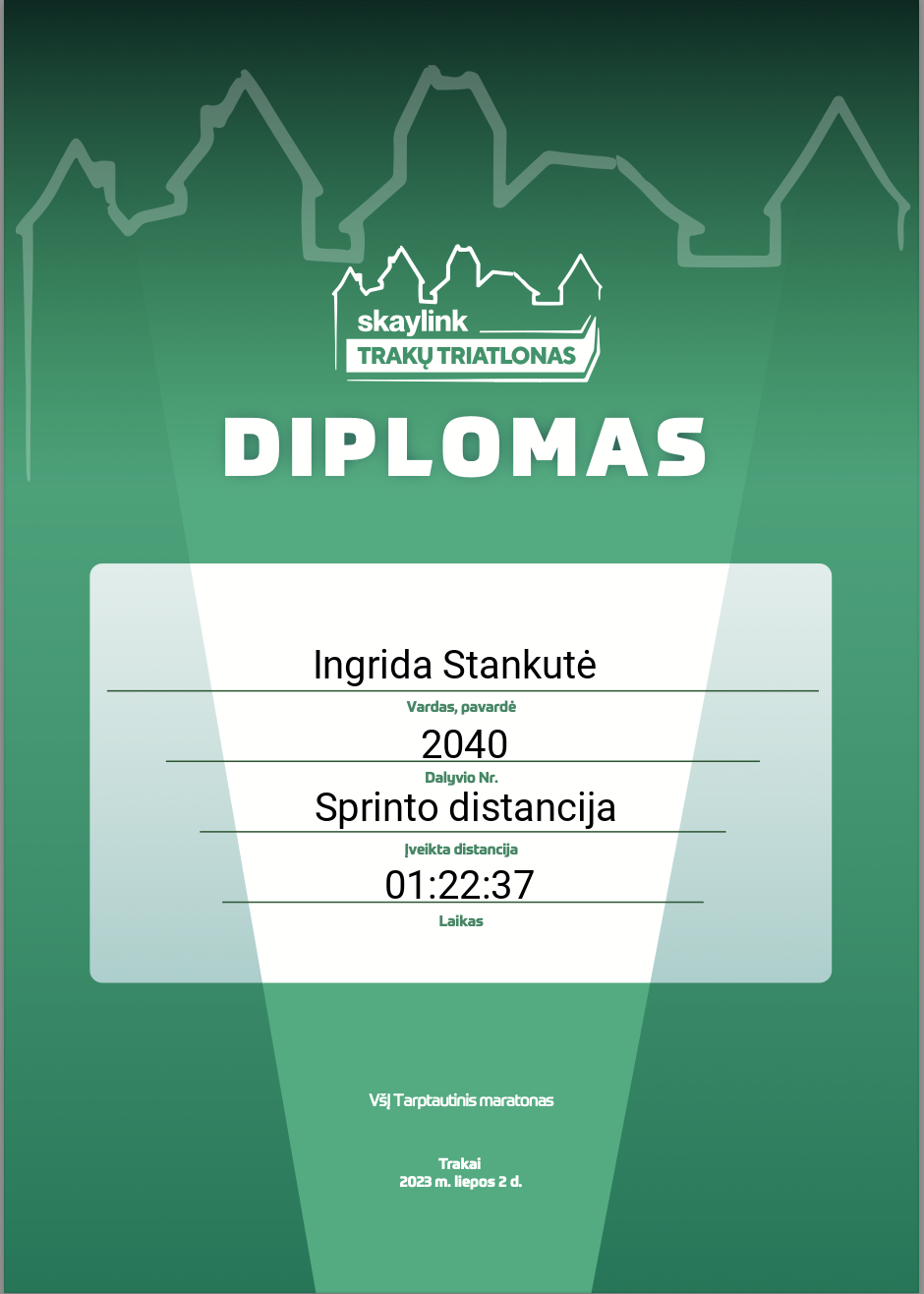 | 69 | Indrė Statkė | Kauno Triatlono Klubas | 2152 | Lithuania | Sprinto distancija | 01:22:30 | Diplomas |