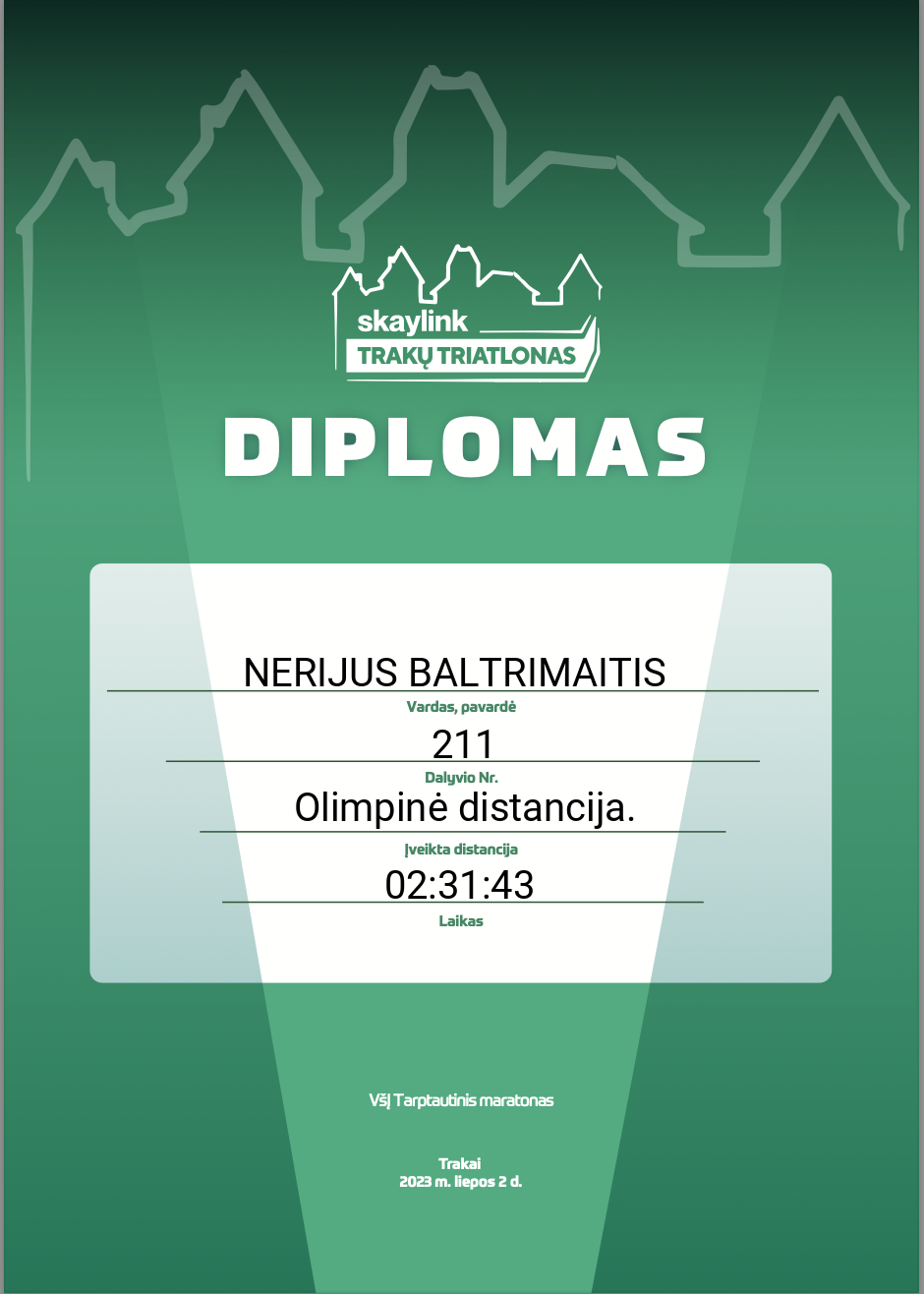 | 63 | NERIJUS BALTRIMAITIS | 211 | Lithuania | Olimpinė distancija. | 02:31:43 | Diplomas | |