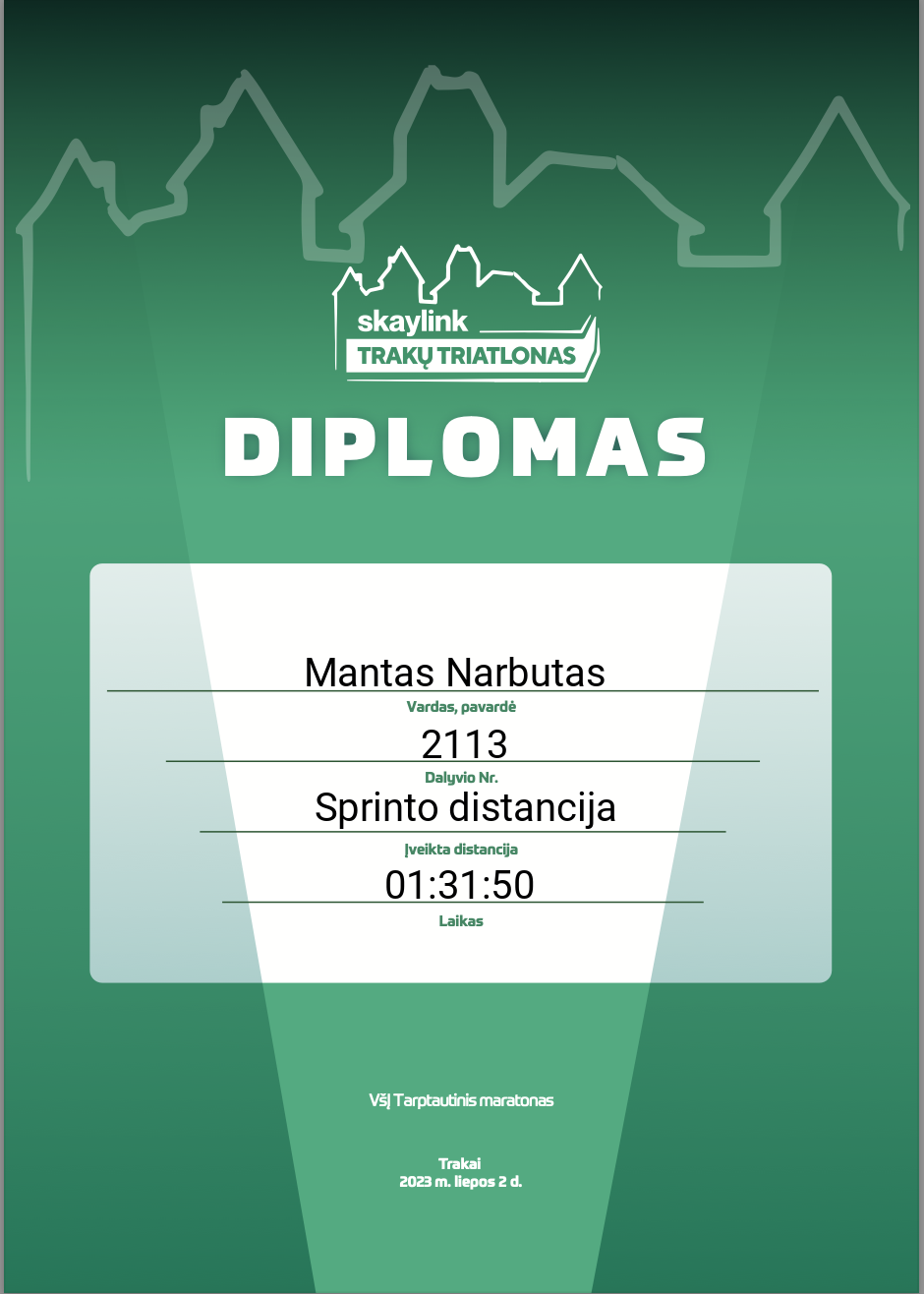| 103 | Giedrius Tuma | Klaipėdos triatlono klubas | 2010 | Lithuania | Sprinto distancija | 01:30:22 | Diplomas |