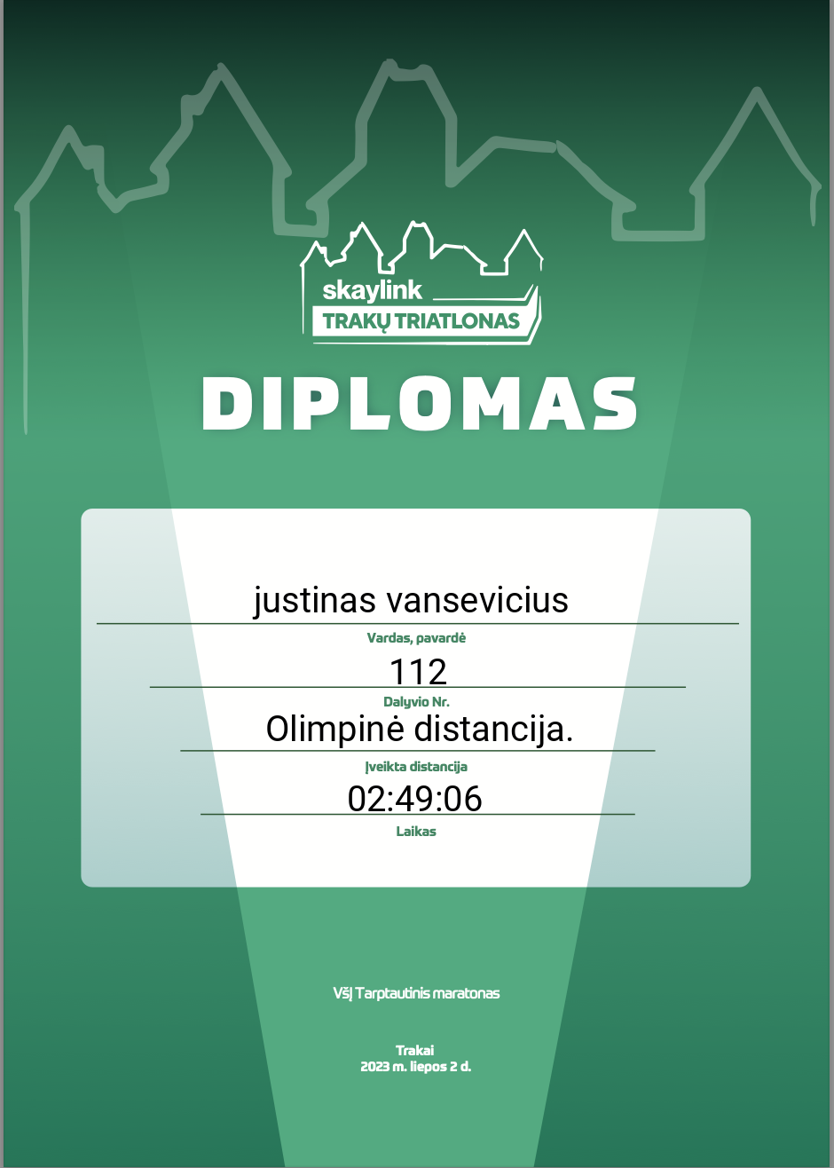 | 123 | justinas vansevicius | 112 | Lithuania | Olimpinė distancija. | 02:49:06 | Diplomas | |