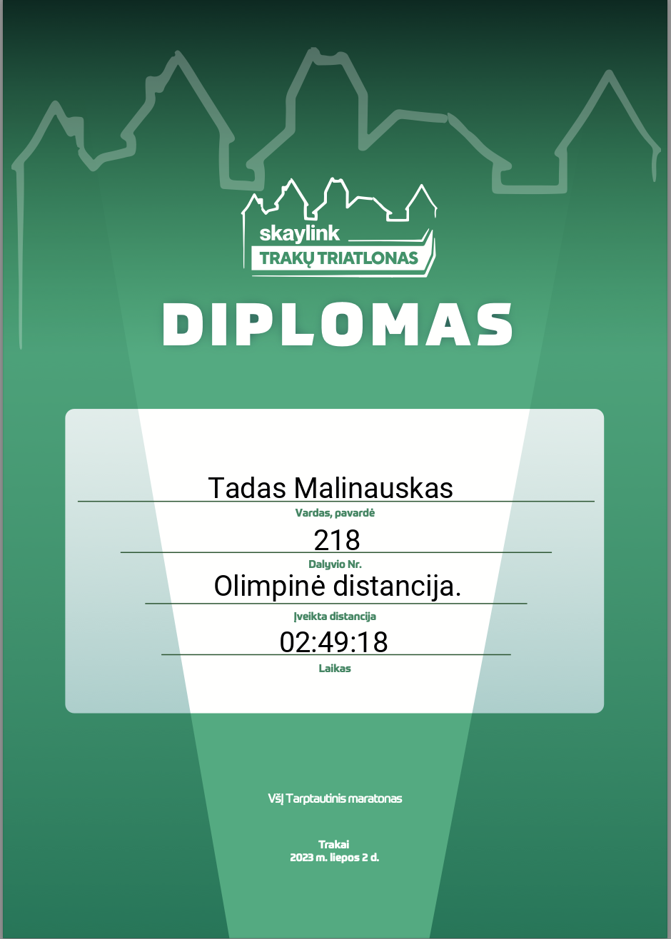 | 125 | Tadas Malinauskas | GustGuru | 218 | Lithuania | Olimpinė distancija. | 02:49:18 | Diplomas |
